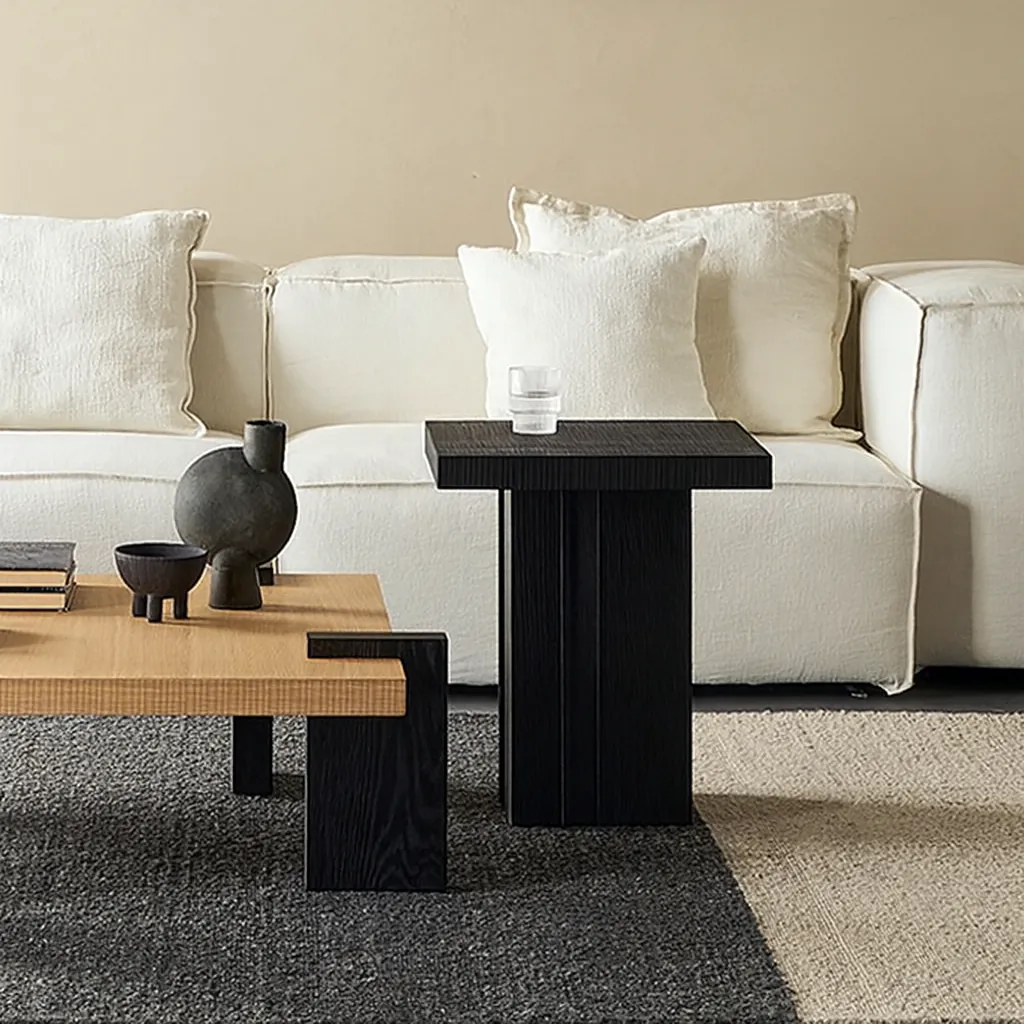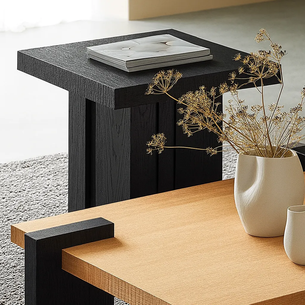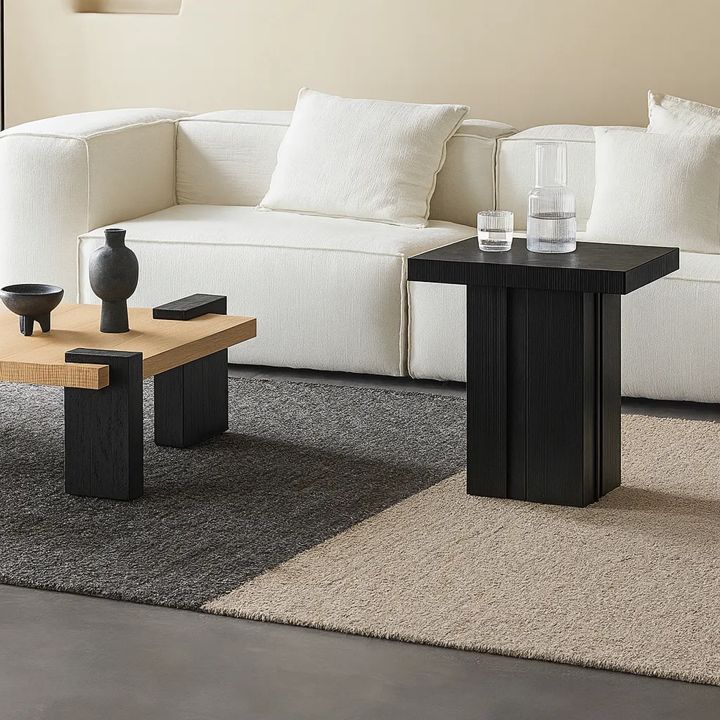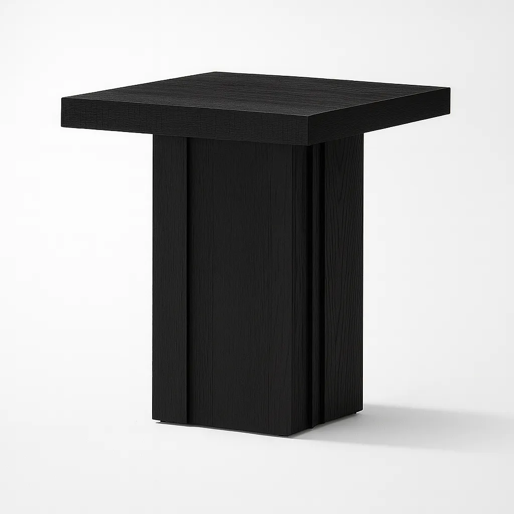Crafted from solid wood with a sleek black finish, this side table embodies modern minimalism. Its square top is supported by a sturdy block-style base, creating a striking architectural silhouette. Perfect as a side table in living rooms, bedrooms, or offices, it serves as both a functional piece and a stylish accent for contemporary spaces.