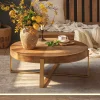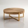 Elegant round coffee table with a wooden top and sturdy gold metal base, perfect for modern living room interiors.