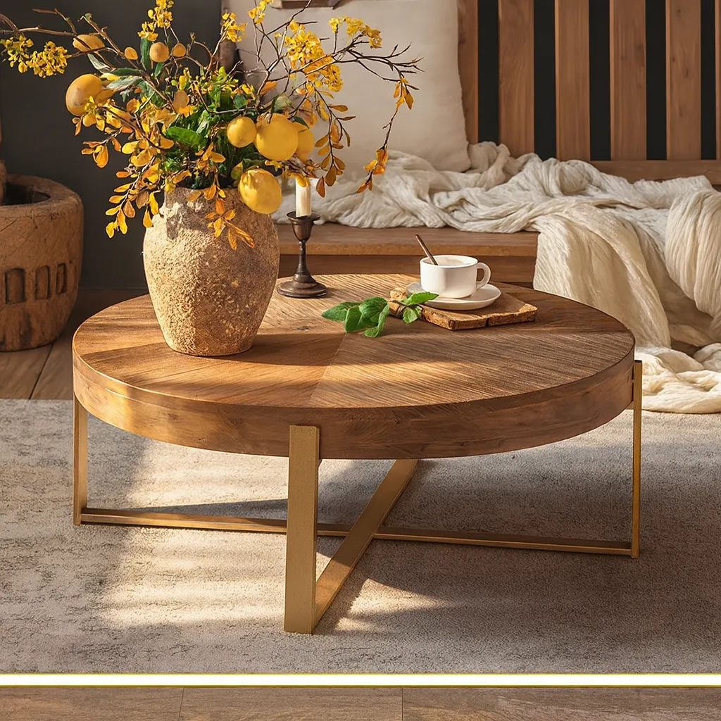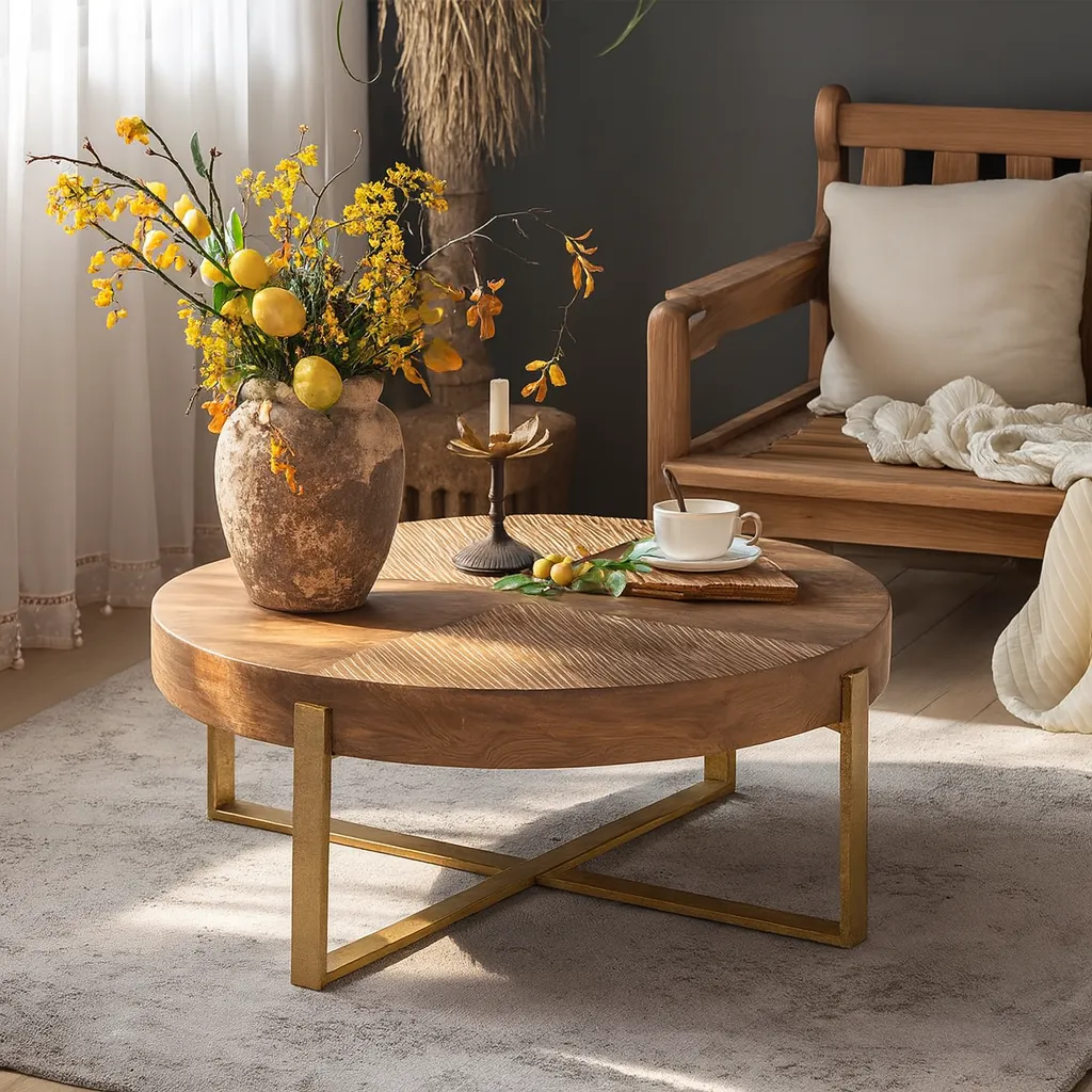 This modern coffee table combines natural warmth with contemporary elegance. The thick round wooden tabletop showcases unique wood grain patterns, while the gold finished metal base adds a touch of luxury and stability. Designed with a cross frame structure, it ensures both style and durability. Ideal as a centerpiece in the living room, this coffee table provides a spacious surface for drinks, décor, or everyday essentials while enhancing the room’s aesthetic.