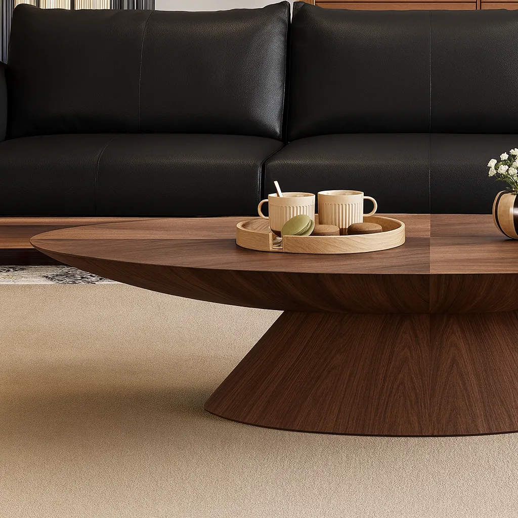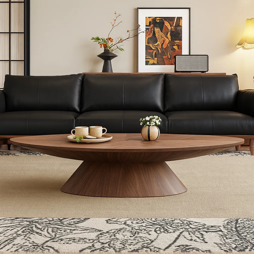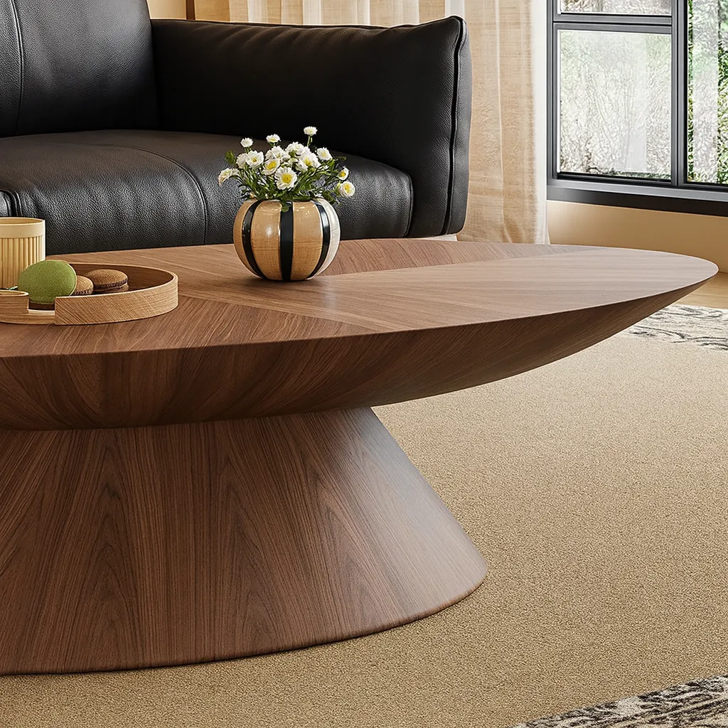 Elegant round wooden coffee table with a wide flared pedestal base, perfect for modern living rooms.
