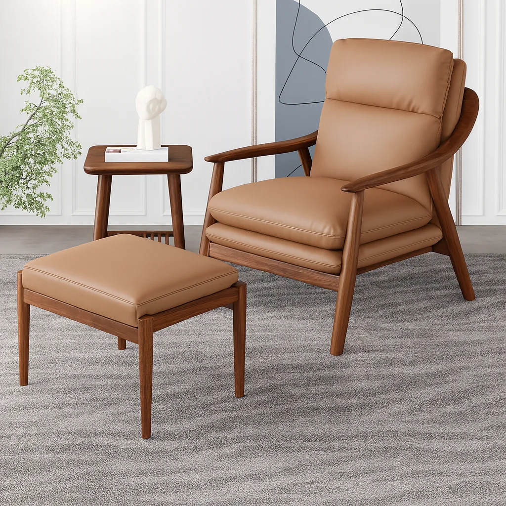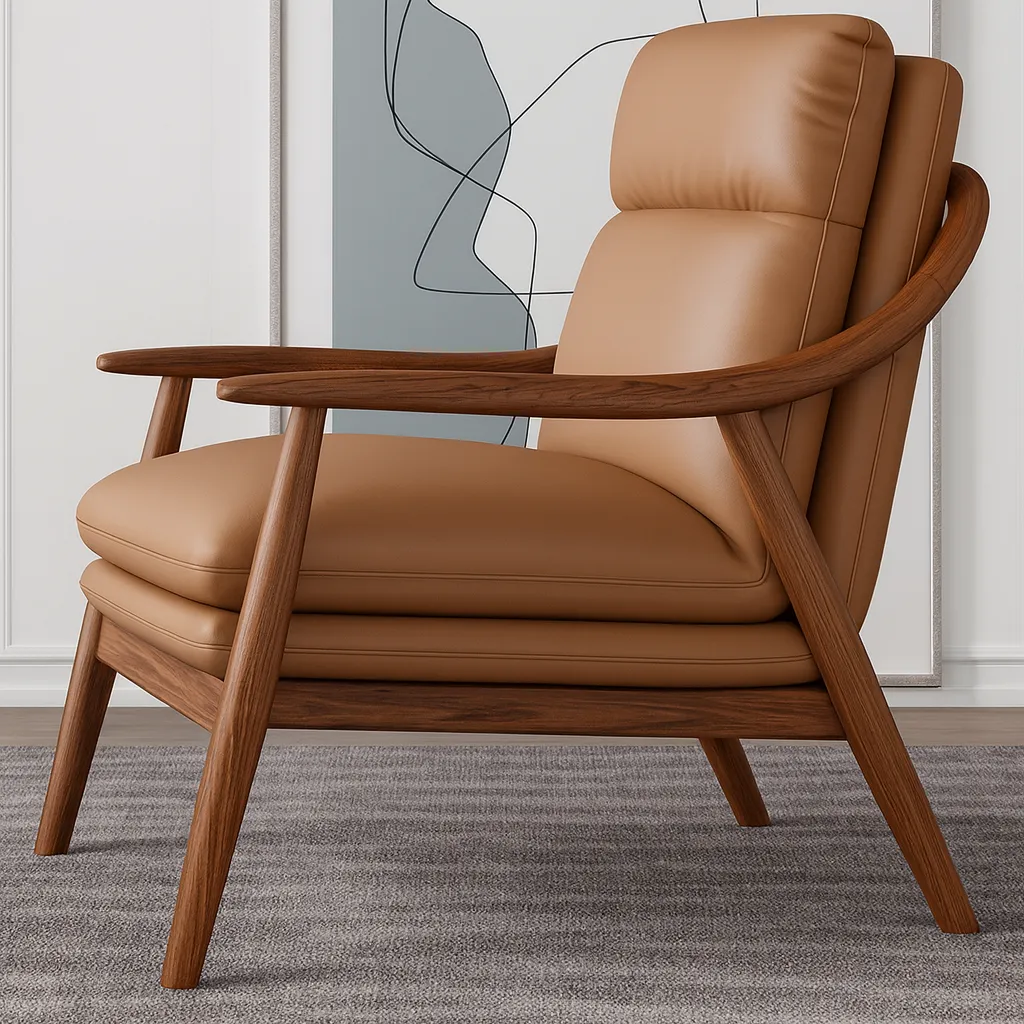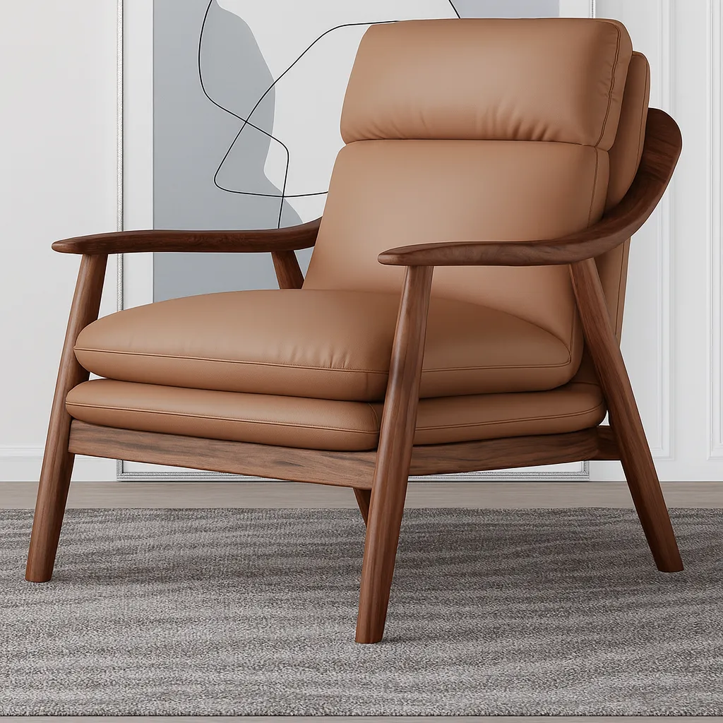 This modern wooden armchair features a solid wood frame combined with soft cushioning to provide a comfortable seating experience. Its clean lines and balanced proportions make it a versatile choice for living rooms, reading corners, or reception areas. The sturdy wooden arms and legs ensure long-lasting durability, while the upholstered seat and backrest add a touch of modern comfort.