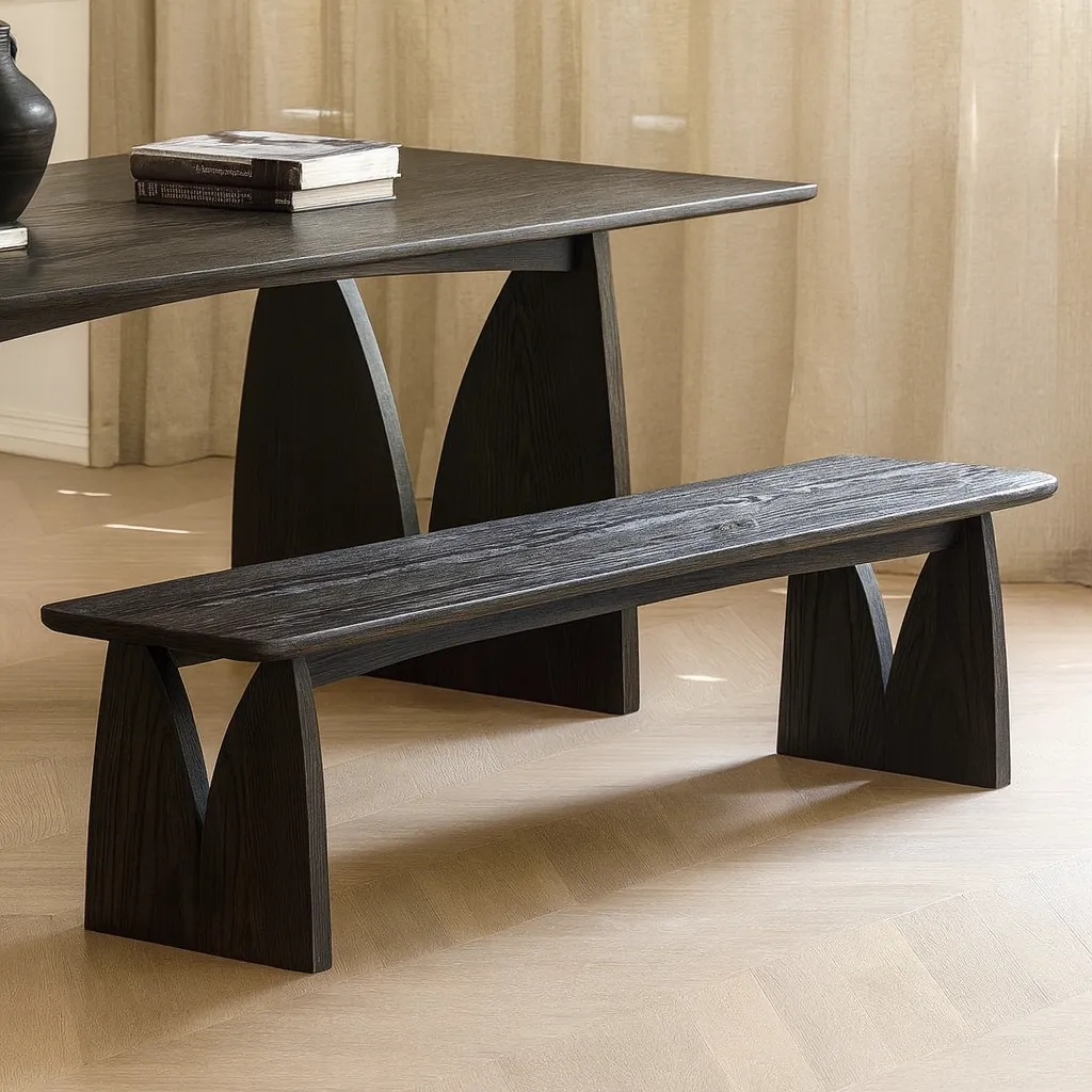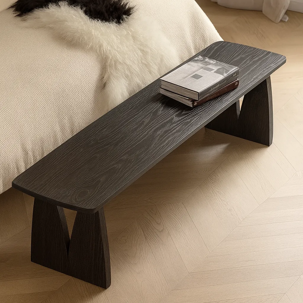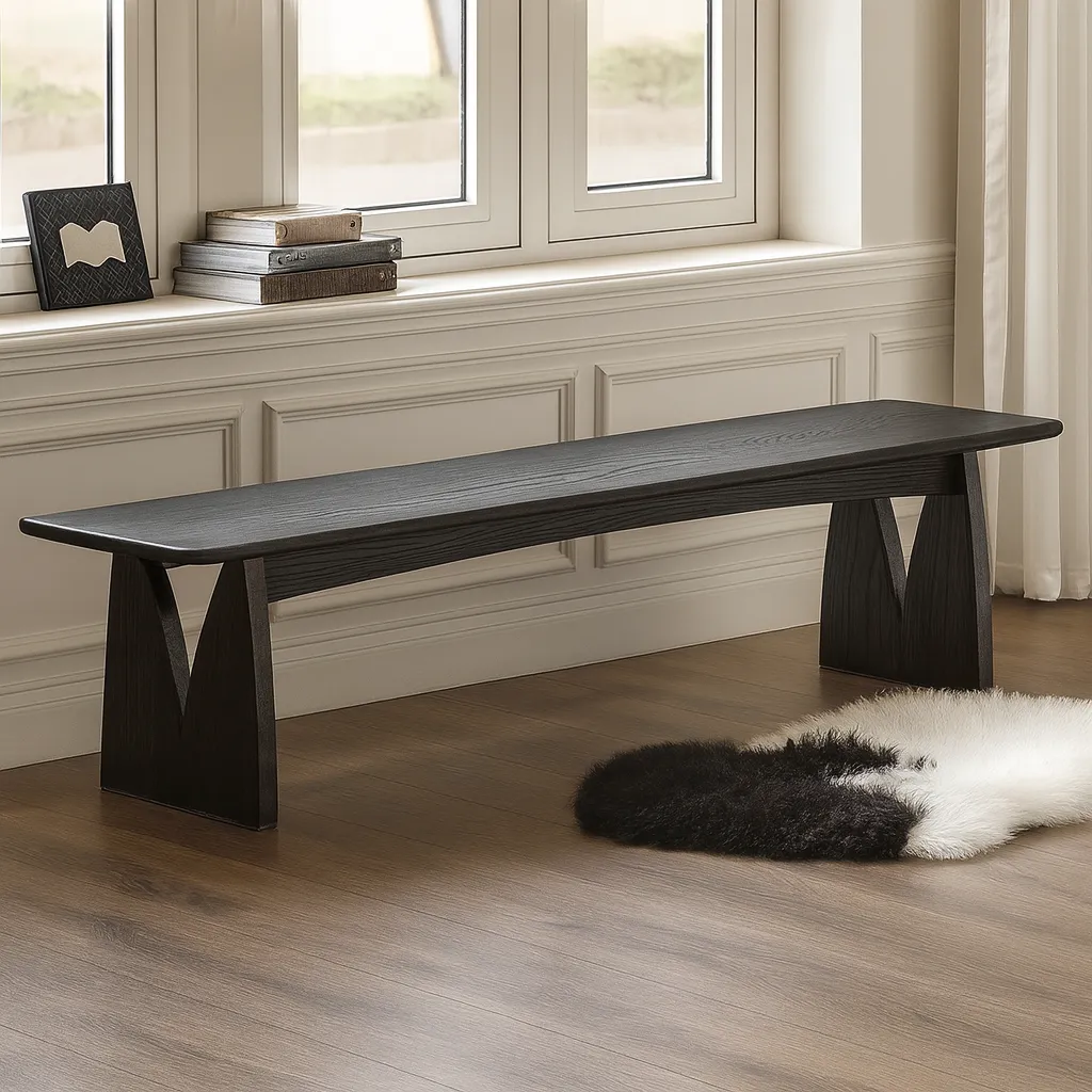 This modern wooden bench showcases clean lines and a minimalist silhouette, highlighted by its unique geometric base that adds a touch of architectural elegance. Crafted with sturdy construction, it provides reliable seating while doubling as a decorative accent. Ideal for living rooms, hallways, or dining areas, this bench blends functionality with modern aesthetics for everyday use.